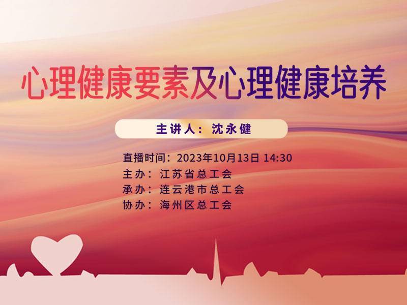10月13日(周五)14:30,《心理安康要素及心理安康造就》走进连云港海州区总工会。南京市总工会意理安康照料专家沈永健,引导各人理性对待各类压力,进步心理安康素养。